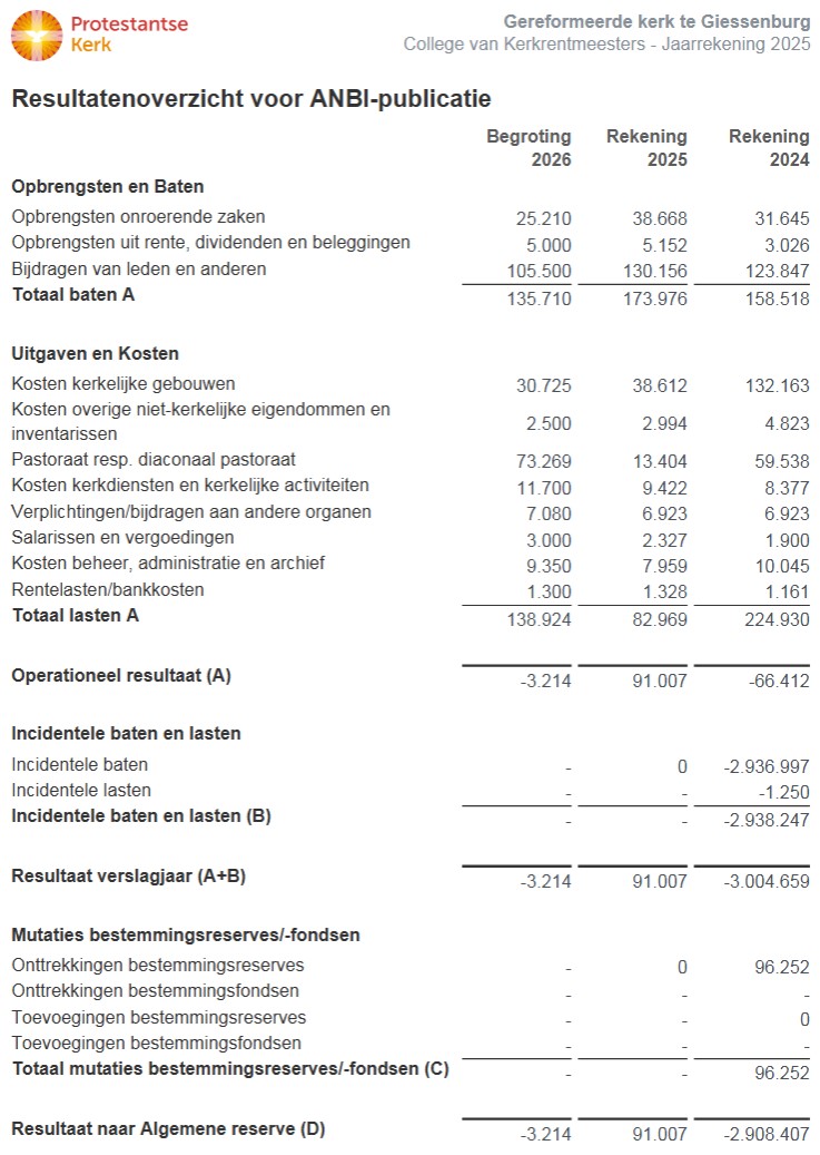 Het beleidsplan van de Protestantse Kerk kunt u vinden via de site van de PKN; https://www.protestantsekerk.nl/anbi-pkn/ Op de website en via de link Beleidsplan 2024-2028 (protestantsekerk.net) vindt u het beleidsplan 2024 - 2028 van onze gemeente. E. Beloningsbeleid De beloning van de predikant van onze gemeente is geregeld in de ‘Generale regeling rechtspositie predikanten’. De hierop betrekking hebbende regelingen vindt u via de site van de PKN. Leden van de kerkenraad, colleges en commissies ontvangen geen vergoeding voor hun werkzaamheden. Alleen werkelijk gemaakte onkosten kunnen worden vergoed. F. Verslag activiteiten De kerkenraad heeft de algemene eindverantwoordelijkheid voor het in stand houden van een levende gemeente. Dat doet zij door zoveel mogelijk gemeenteleden in te schakelen bij het plaatselijk werk. Enkele taken zijn conform de Kerkorde gedelegeerd naar afzonderlijke colleges, waaronder het college van kerkrentmeesters en het college van diakenen. Zij waken over de financiële slagkracht van de gemeente en leggen via een jaarverslag rekening en verantwoording af aan de kerkenraad. Een uittreksel van de belangrijkste gegevens treft u hieronder aan. G. Voorgenomen bestedingen De verwachte bestedingen (begroting) sluiten als regel nauw aan bij de rekeningen over de voorgaande jaren. Het plaatselijk kerkenwerk vertoont een grote mate van continuïteit : de predikanten of andere werkers verrichten hun werkzaamheden, kerkdiensten worden gehouden en ook andere kerkelijke activiteiten vinden plaats. H. Verkorte staat van baten en lasten met toelichting Onderstaande staat van baten en lasten geeft via de kolom begroting inzicht in de begrote ontvangsten en de voorgenomen bestedingen. De kolom rekening geeft inzicht in de daadwerkelijk gerealiseerde ontvangsten en bestedingen. De voorgenomen bestedingen voor het komende jaar zullen niet sterk afwijken van de voorgenomen bestedingen van het verslagjaar. ![]() Toelichting Kerkgenootschappen en hun onderdelen zorgen in Nederland zelf voor de benodigde inkomsten voor hun activiteiten. Aan de kerkleden wordt elk jaar via Actie Kerkbalans gevraagd om hun bijdrage voor het werk van de kerkelijke gemeente waartoe zij behoren. Soms bezit de kerkelijke gemeente ook nog enig vermogen in de vorm van onroerend goed of geldmiddelen. De opbrengsten van dit vermogen worden aangewend voor het werk van de gemeente. Kerken ontvangen geen overheidssubsidie in Nederland, behoudens voor de instandhouding van monumentale (kerk)gebouwen of een specifiek project. Een groot deel van de ontvangen inkomsten wordt besteed aan pastoraat, in de vorm van het salaris voor de predikant en aan de organisatie van kerkelijke activiteiten. Daarnaast worden de ontvangen inkomsten ook besteed aan het in stand houden van de kerkelijke bezittingen, benodigd voor het houden van kerkdiensten (zoals onderhoud, energie, belastingen en verzekeringen) en aan de kosten van de eigen organisatie en bijdragen voor het in stand houden van het landelijk werk. |